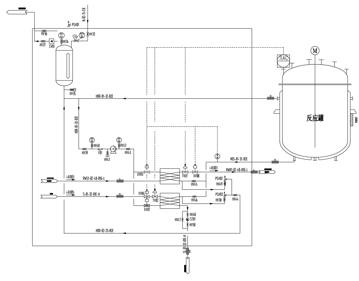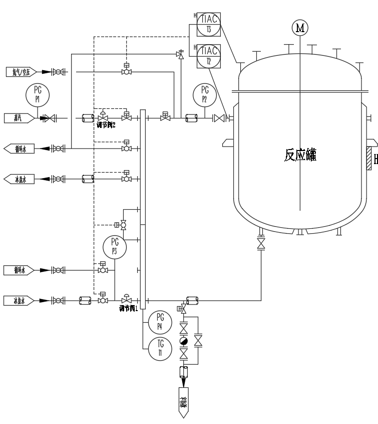 反應(yīng)釜溫控方式的選擇對于整個原料藥生產(chǎn)過程來說至關(guān)重要,反應(yīng)釜一般通過夾套、半管、內(nèi)盤管,或幾種組合起來移除反應(yīng)熱或為反應(yīng)供熱,不同設(shè)備控制策略不盡相同,對于超低溫反應(yīng)釜(使用液氮的工況)和超高溫反應(yīng)釜(150℃以上)溫控策略也不太一樣,本文僅針對一般溫控范圍(-15℃~150℃)不帶內(nèi)盤管的夾套溫控方式進(jìn)行討論。