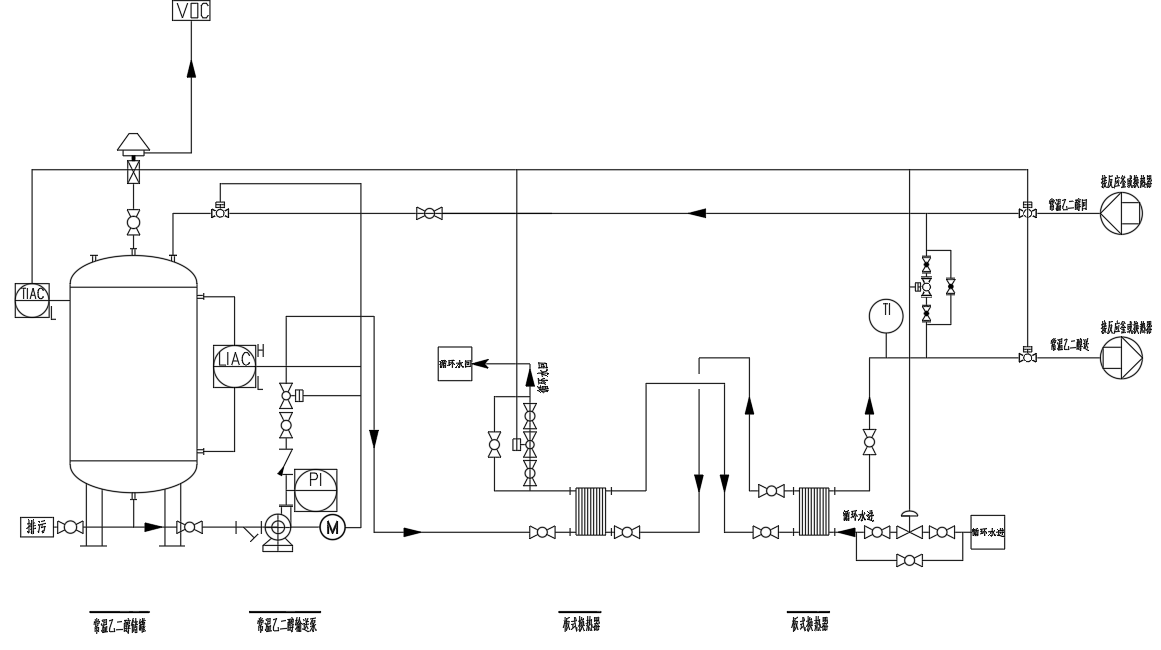 一般使用的媒介為乙二醇、丙二醇、改性乙二醇或改性丙二醇的水溶液,根據(jù)溫控需求配置不同的濃度。分為無動力混合系統(tǒng)(圖2)和有動力混合系統(tǒng)(圖3)。此系統(tǒng)需要配備相應(yīng)的公用工程系統(tǒng)(圖4、圖5、圖6)。