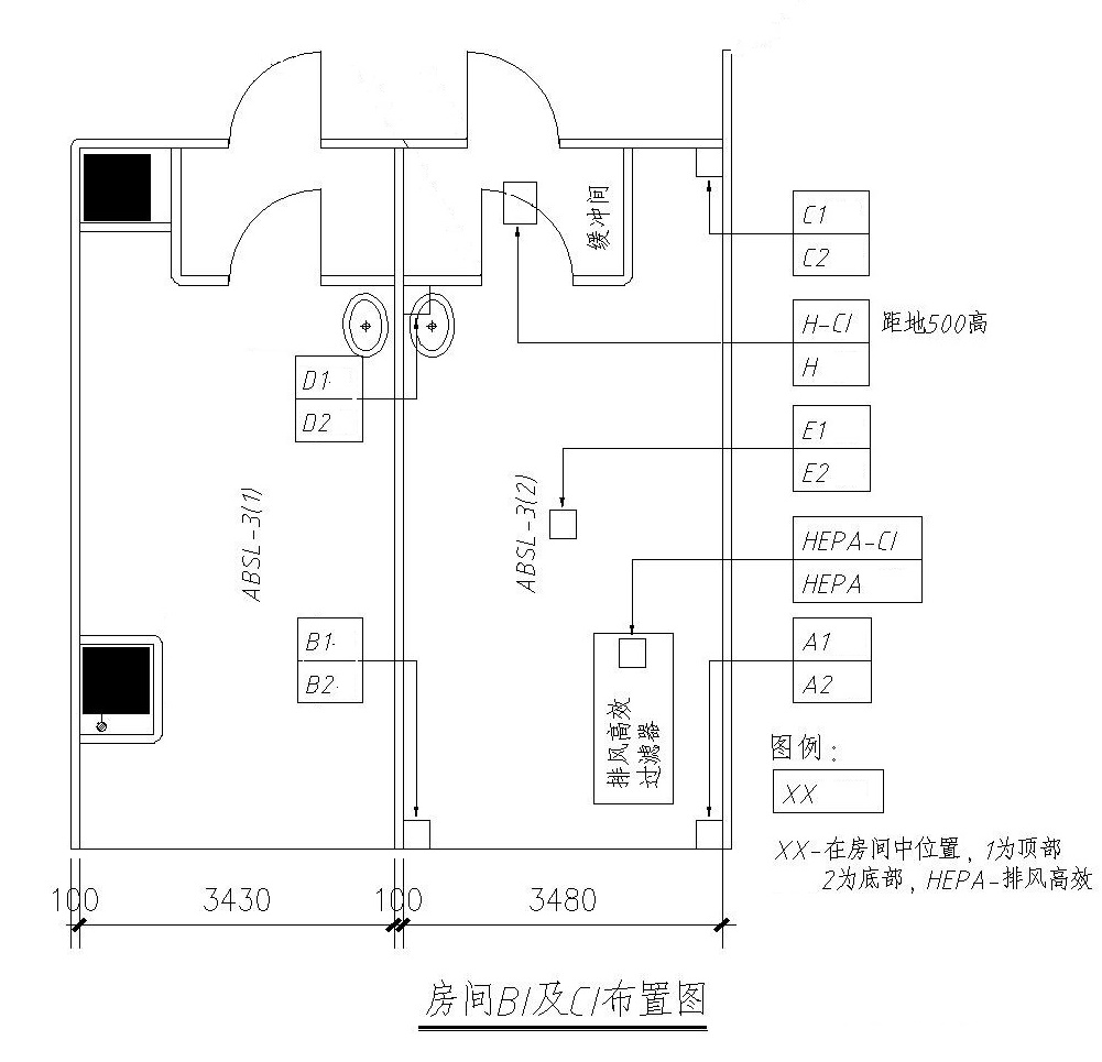 u 消毒空間:室內(nèi)設(shè)置有生物安全柜、小動(dòng)物負(fù)壓隔離器、實(shí)驗(yàn)臺(tái)、天平、顯微鏡、離心機(jī)等;