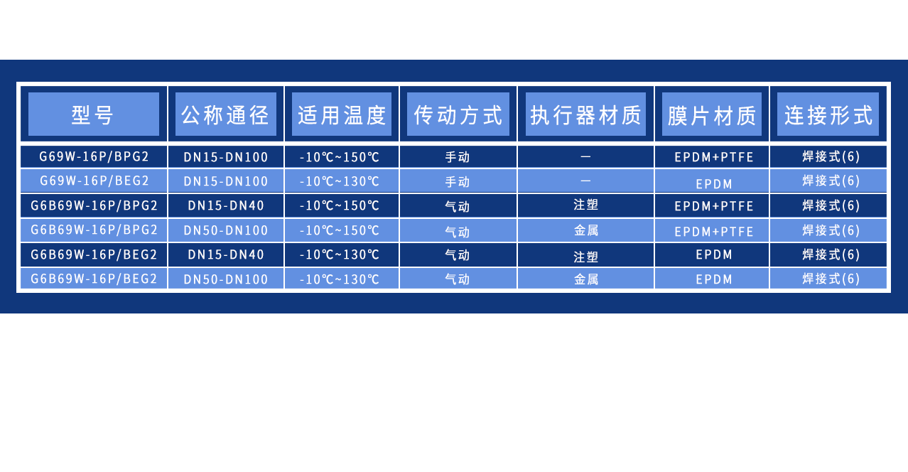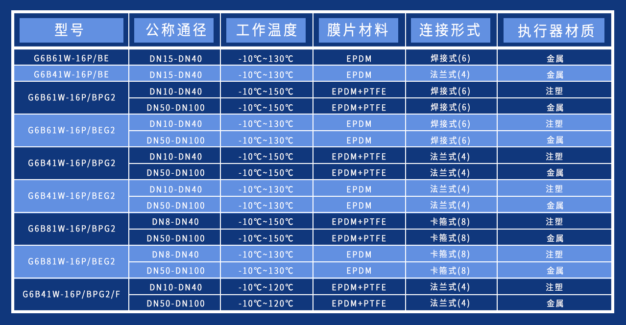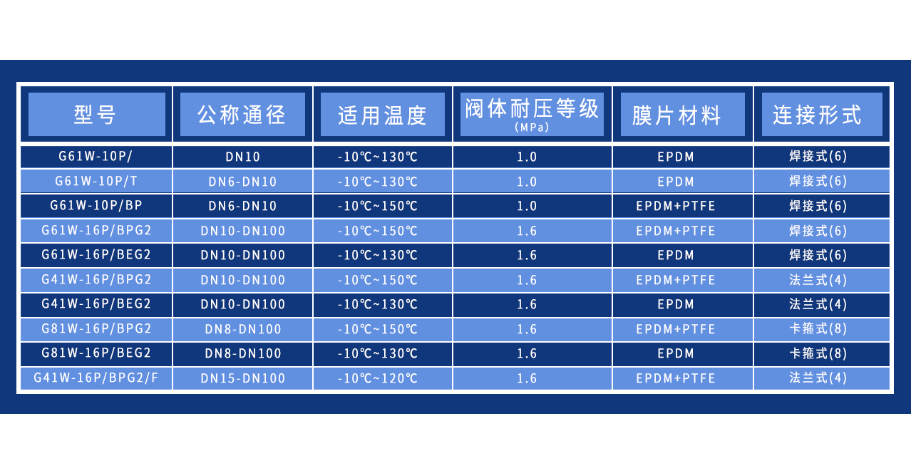工作溫度:1)EPDM膜片:-10℃~130℃
